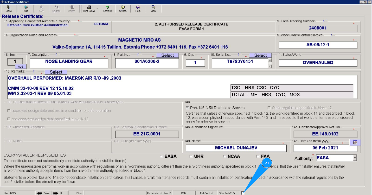 21. If a certificate needs to be issued for a new manufactured product, you must click in the window "Filter Part-21G".