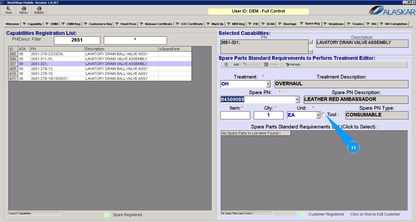 11. If necessary, if the required spare part is a tool tick in the window "Tool".