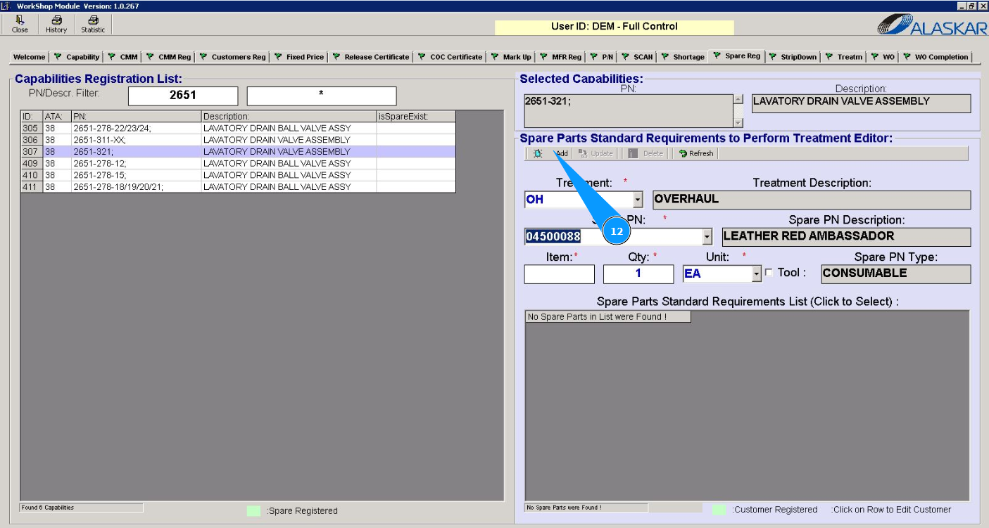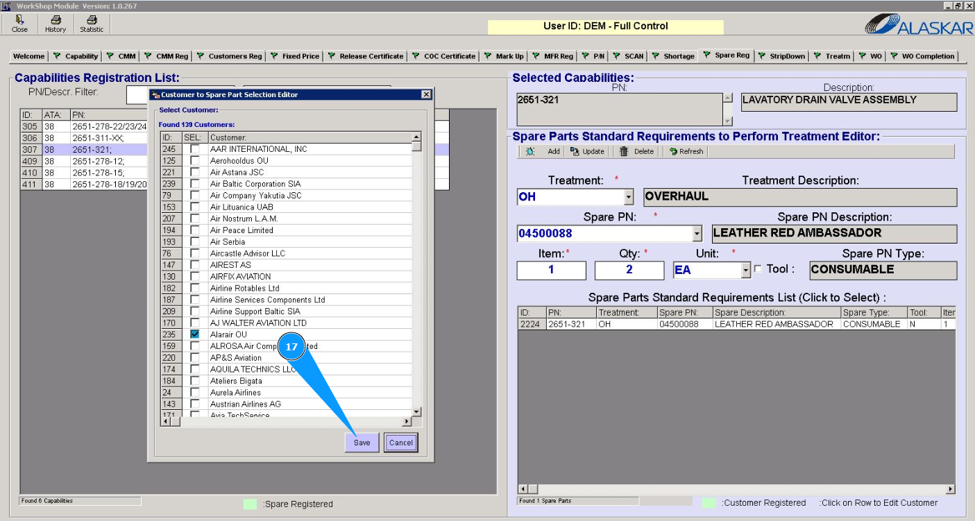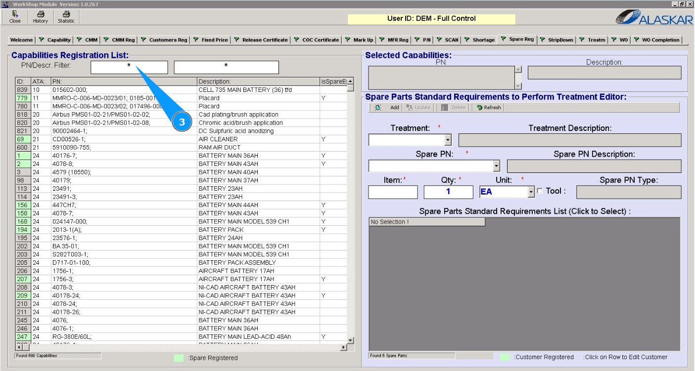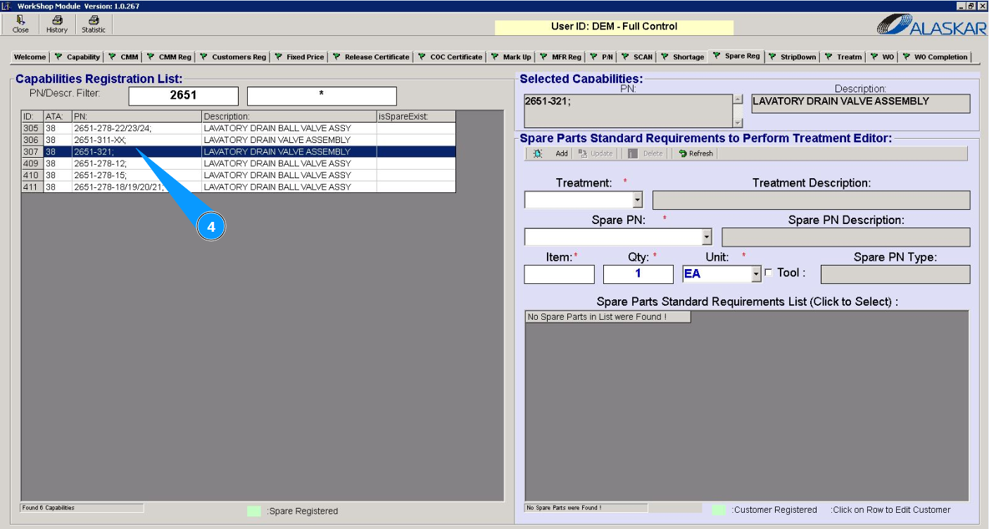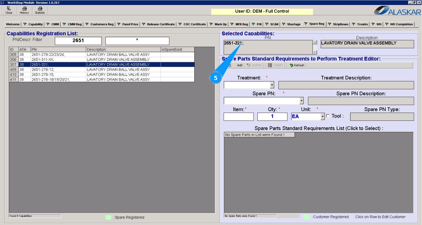 4. Select the required part number from the list and click on the corresponding line in the window "Capabilities Registration List".