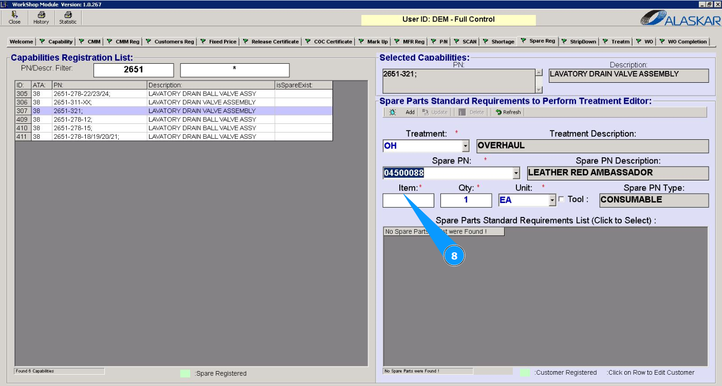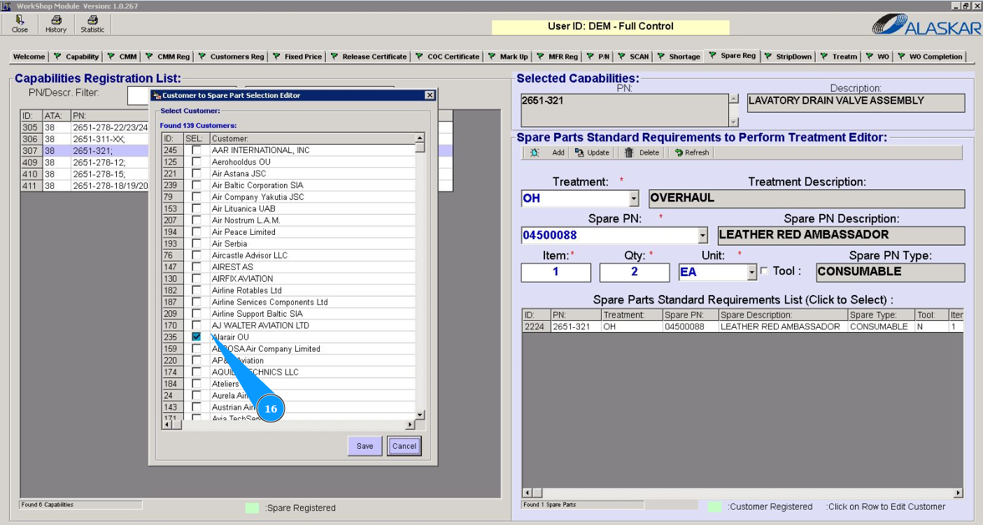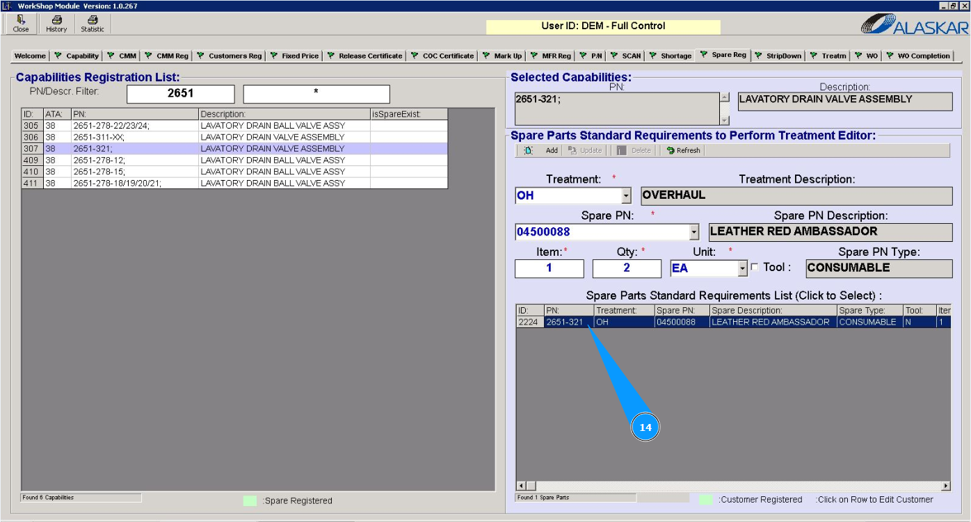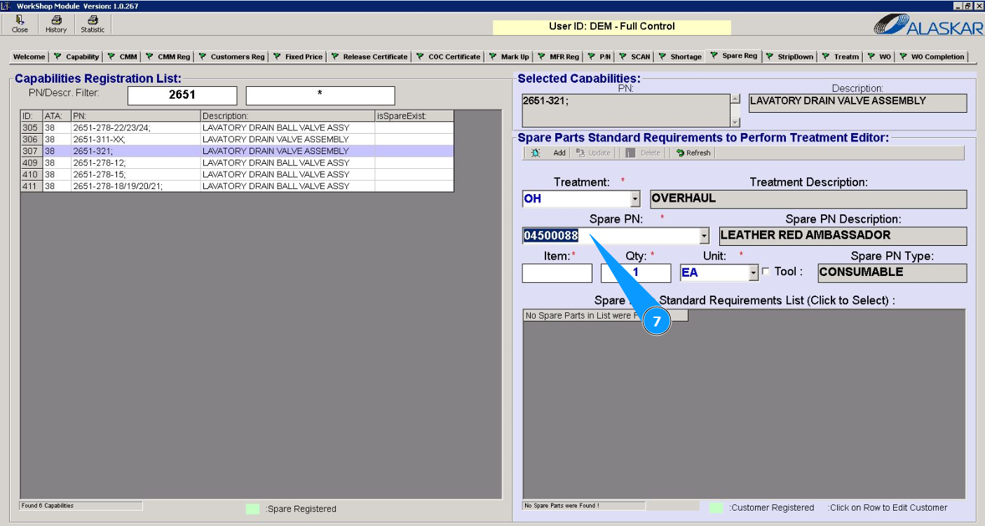 4. Select the required part number from the list and click on the corresponding line in the window "Capabilities Registration List".