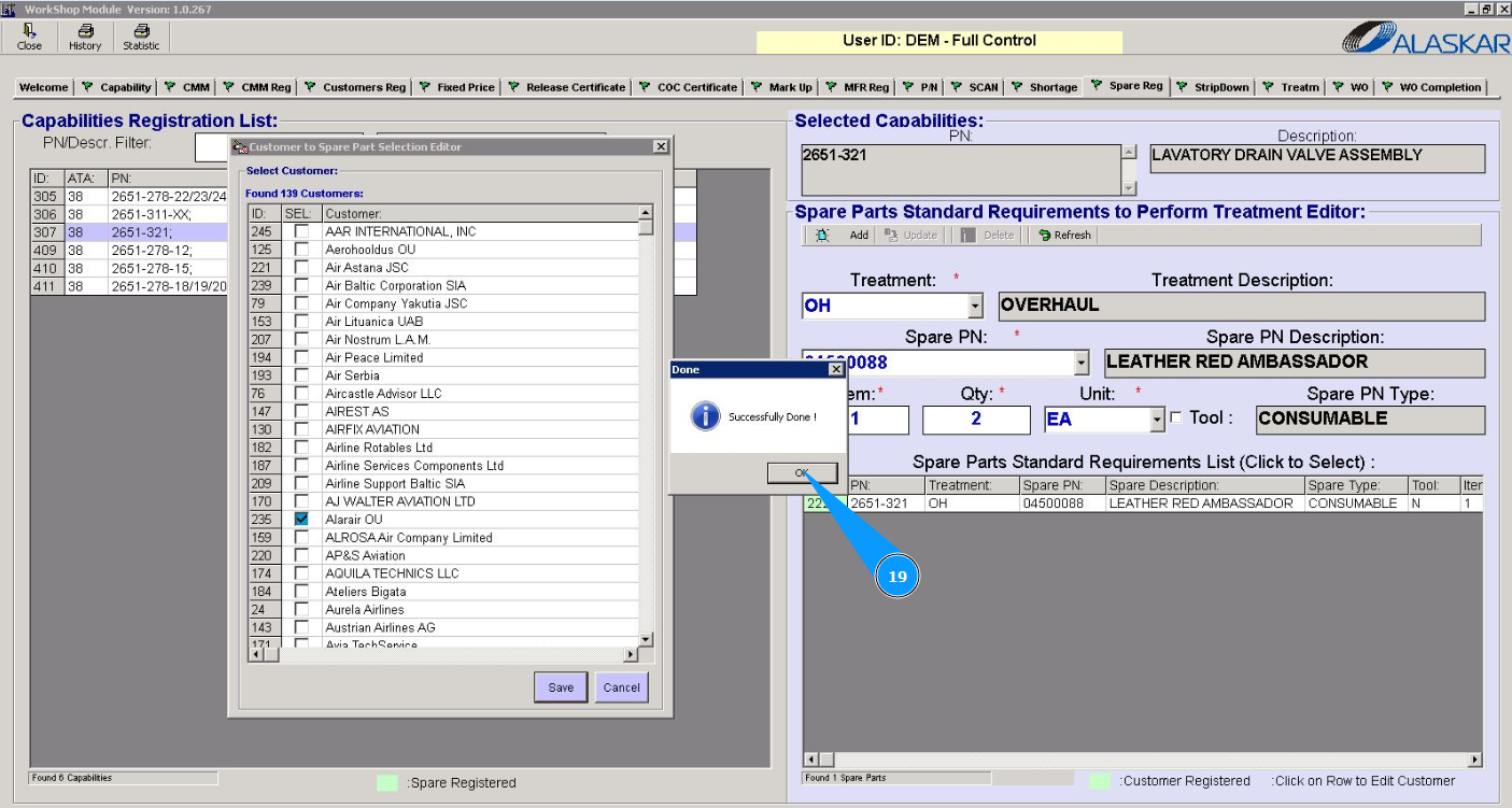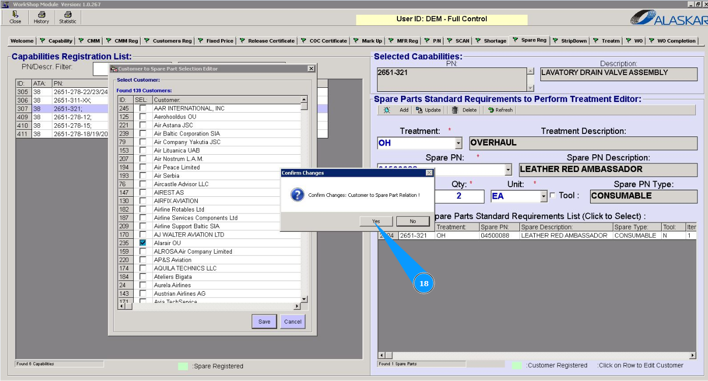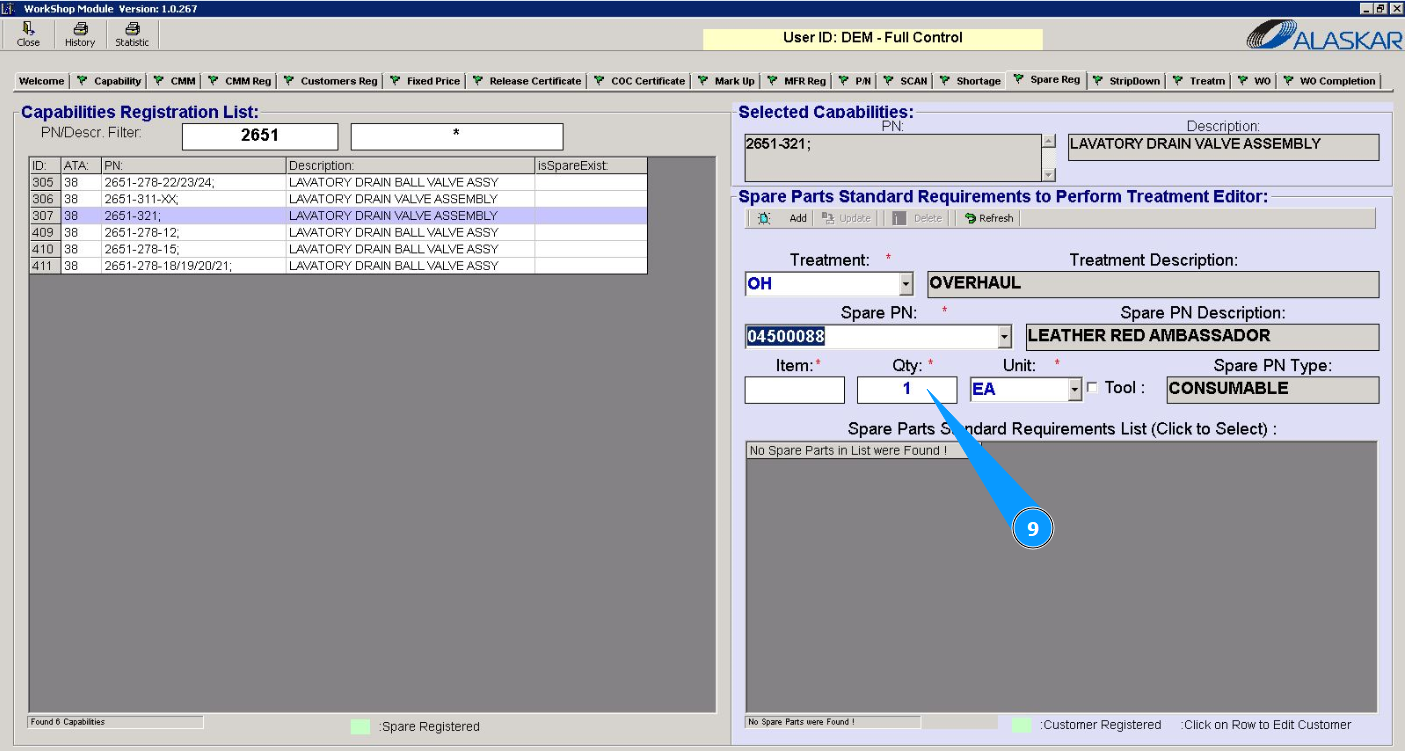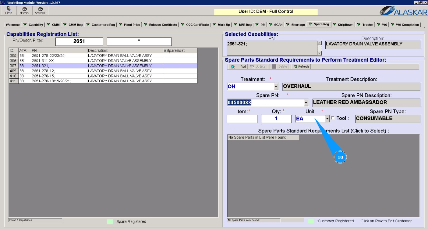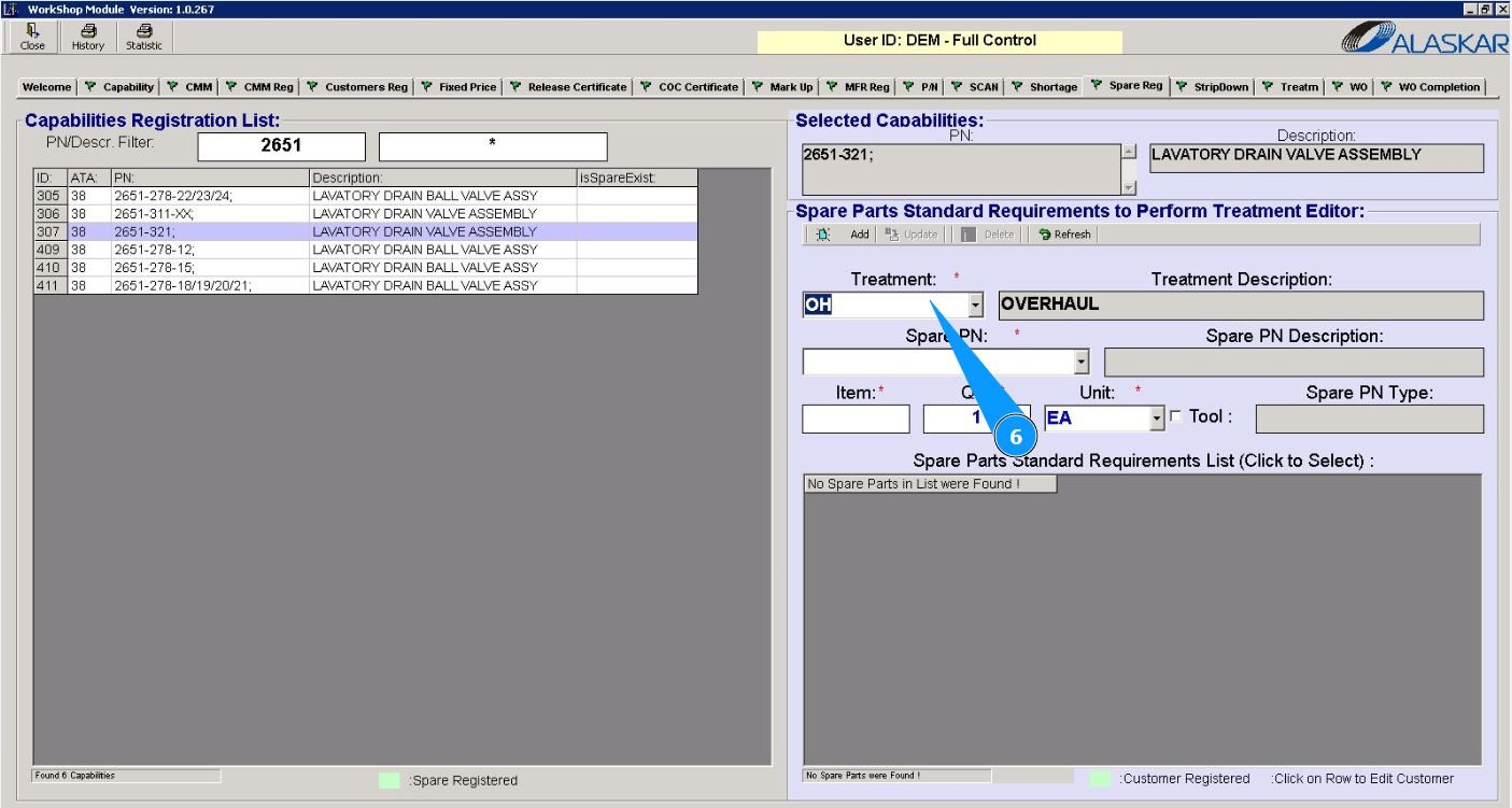 4. Select the required part number from the list and click on the corresponding line in the window "Capabilities Registration List".