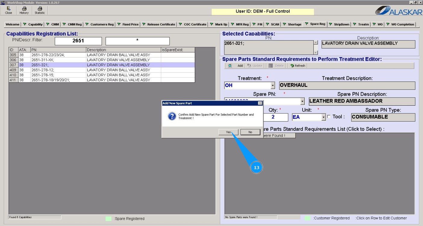 13. Click on the button "Yes" to confirm adding the spare part data to the program.