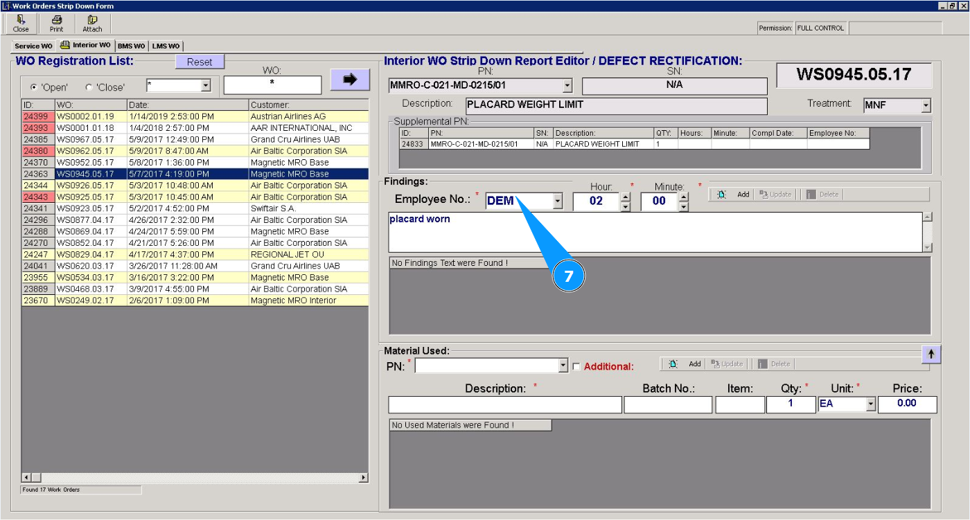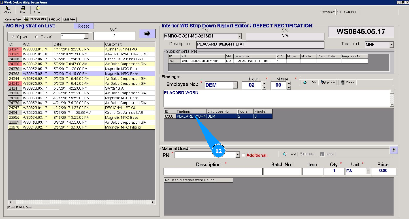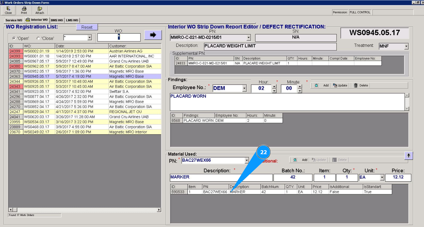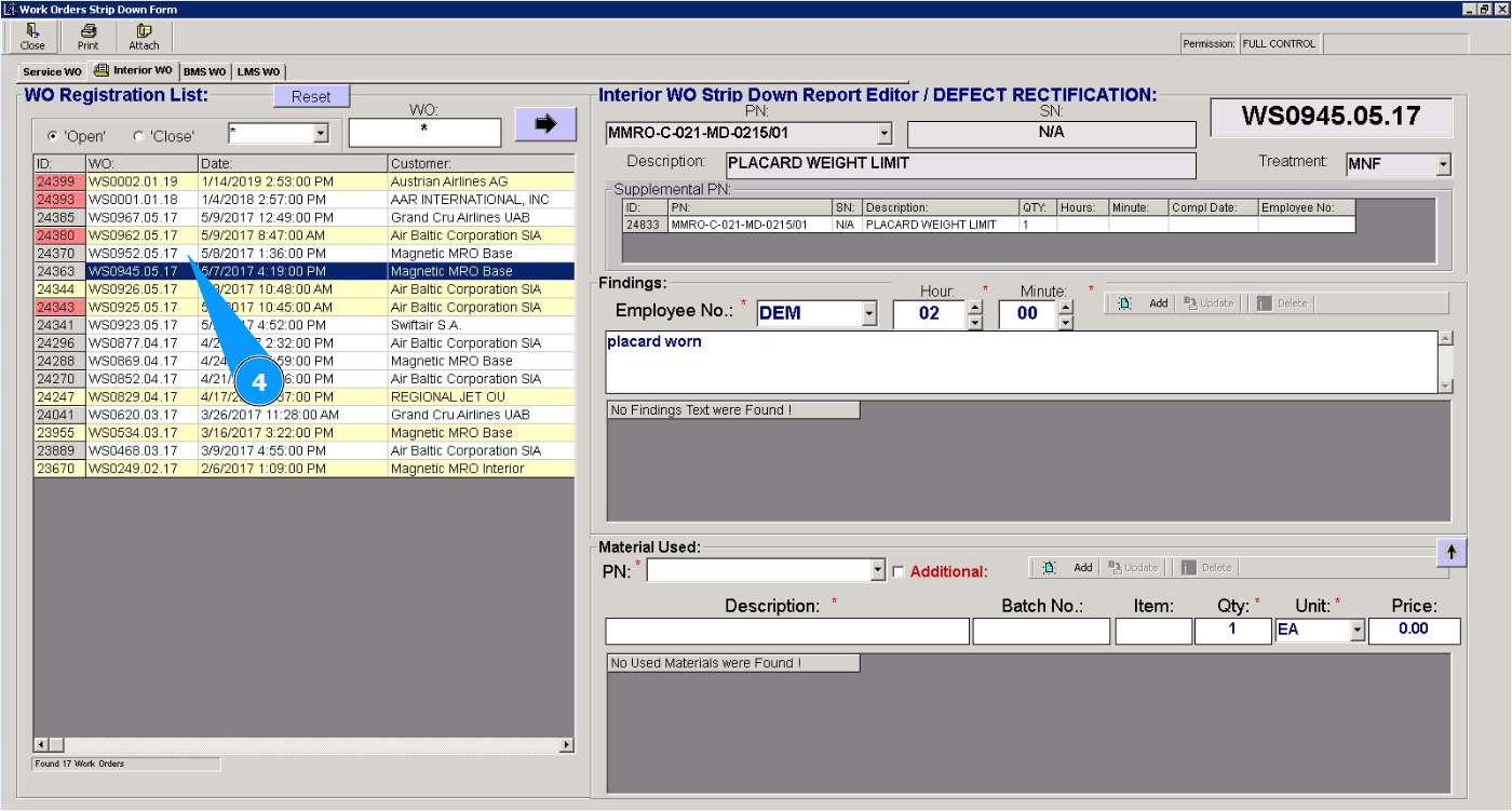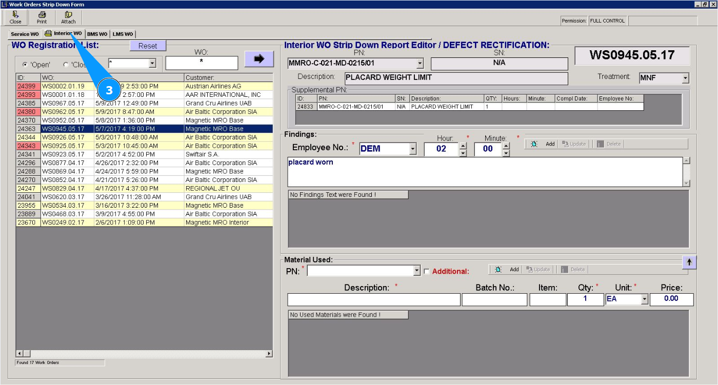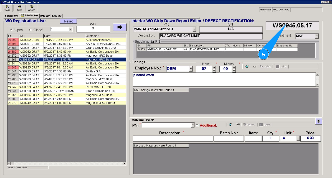 5. Check that the required interior WO order is displayed in the window "Interior WO Strip Down Report Editor/Defect Rectification".