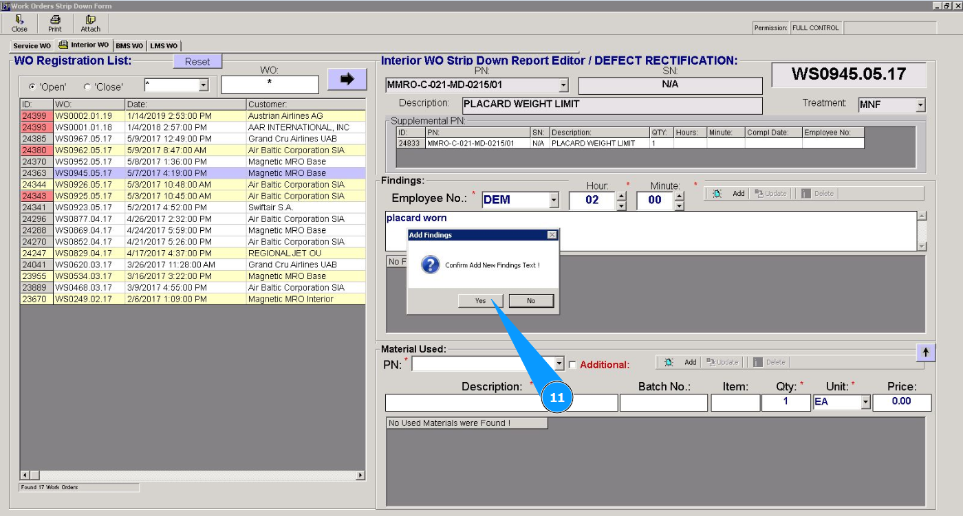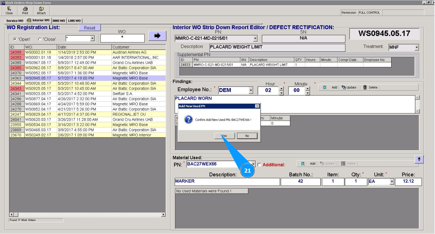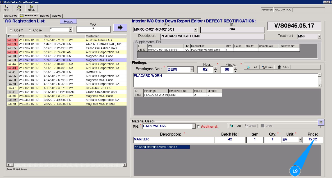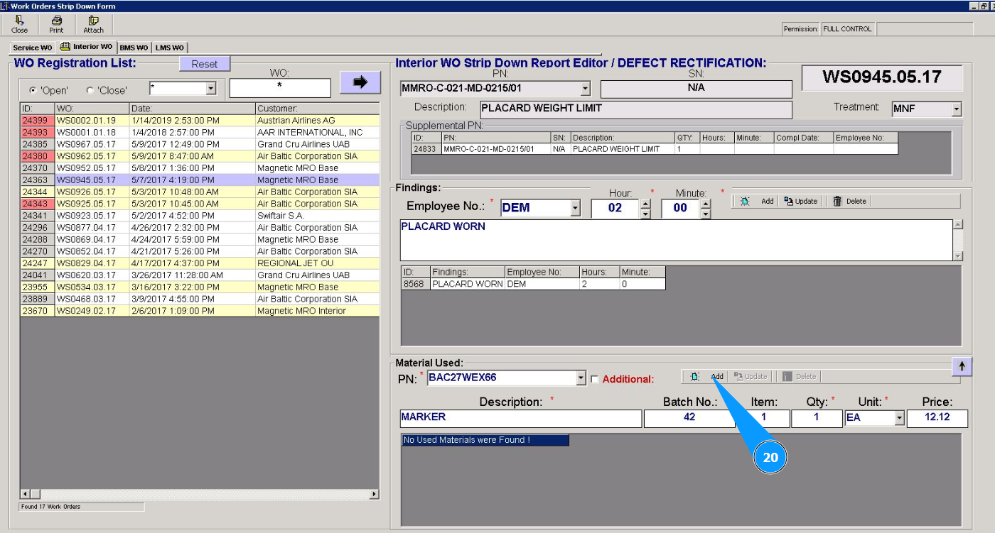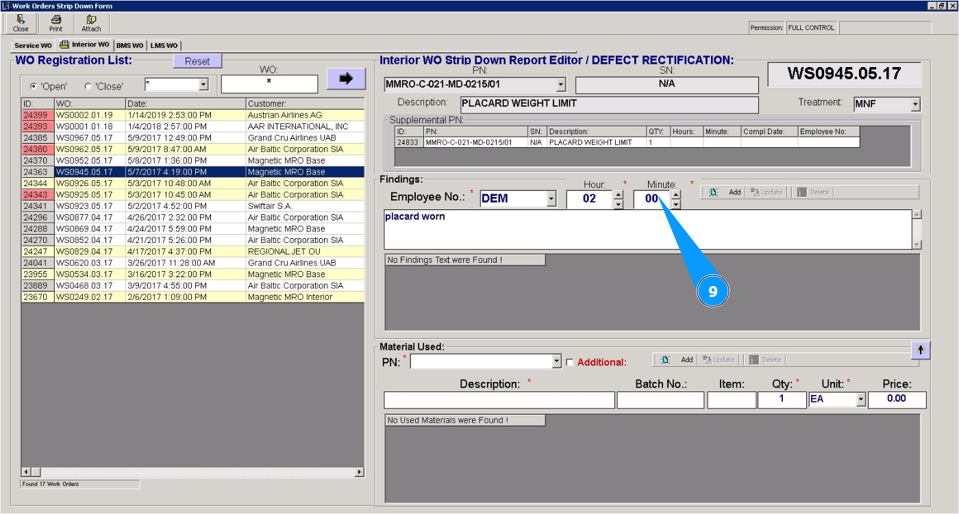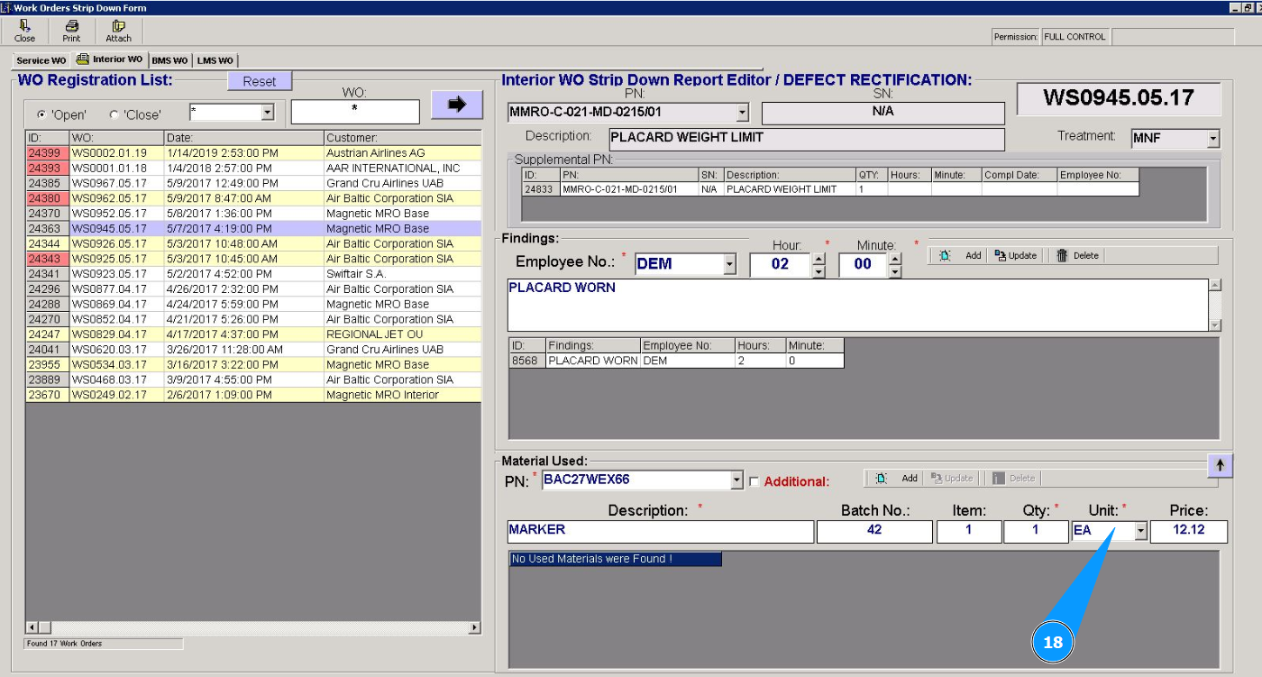 5. Check that the required interior WO order is displayed in the window "Interior WO Strip Down Report Editor/Defect Rectification".