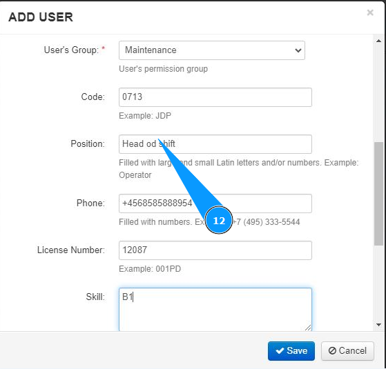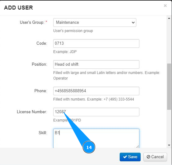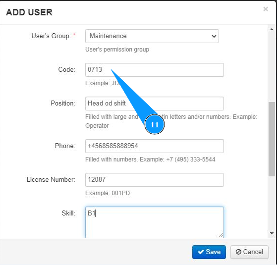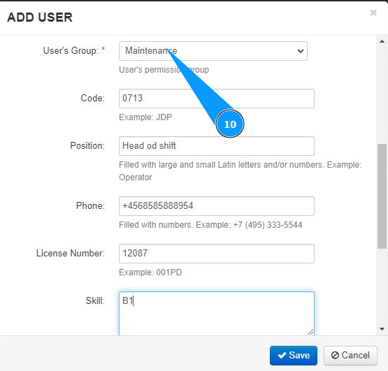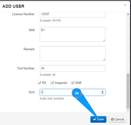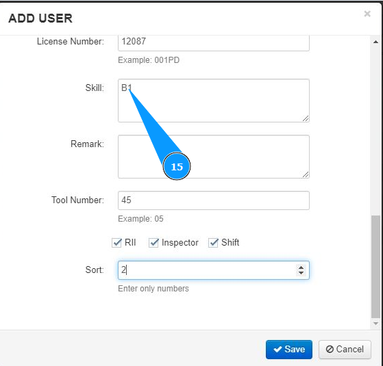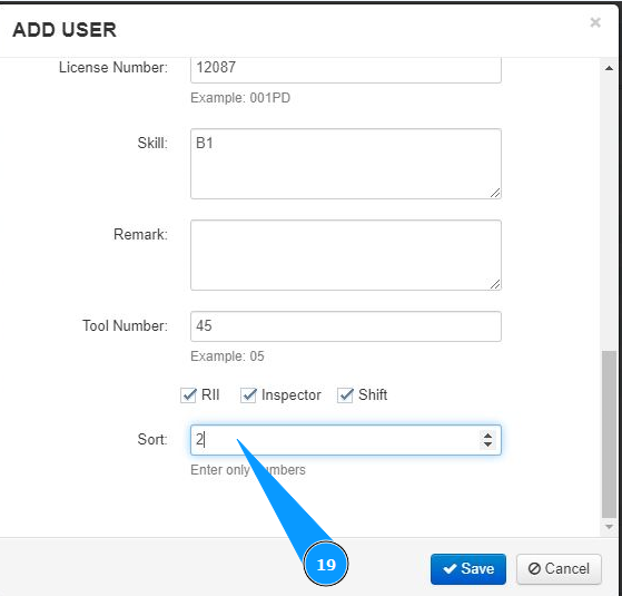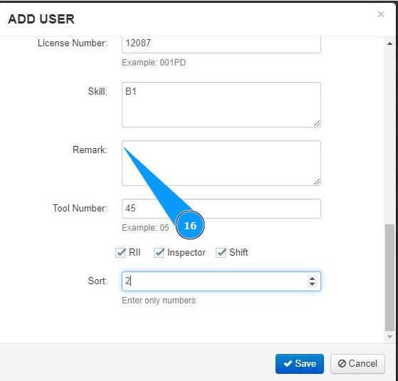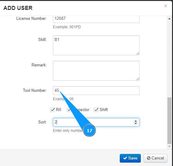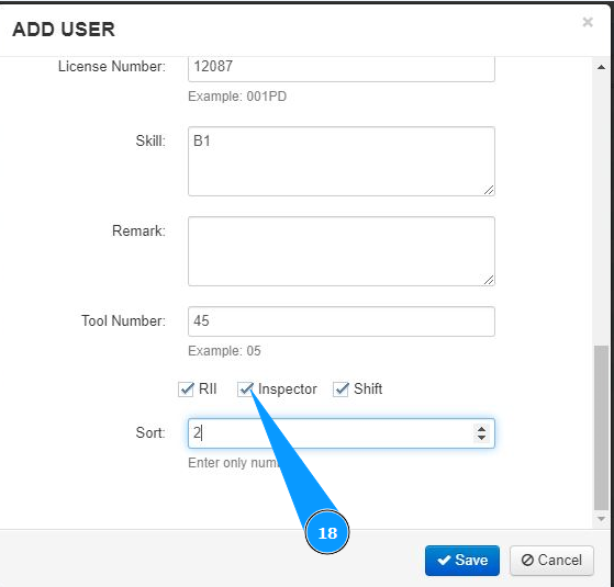 18. При необходимости, внесите номер возможность нового пользователя выполнять работы по заменам, инспекциям или действовать как начальник смены (в соответствии с политикой вашей компании) в полях "RII", "Inspector", "Shift".