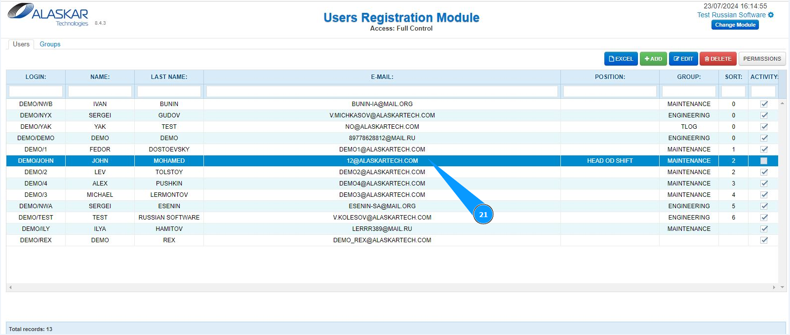 21. Проконтролируйте, что запись с внесенным новым пользователем отображается в окне "User Registration Module".