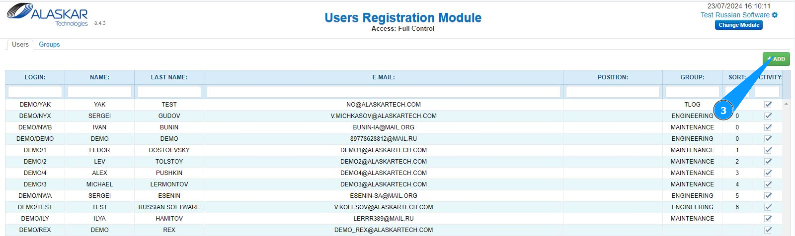 2. Проконтролируйте, что раздел работы с пользователями открылся и доступен в окне "User Registration Module".