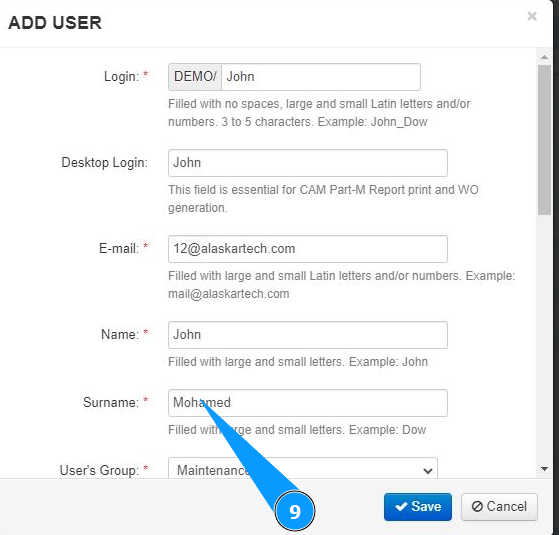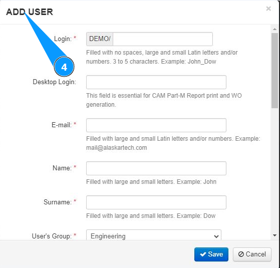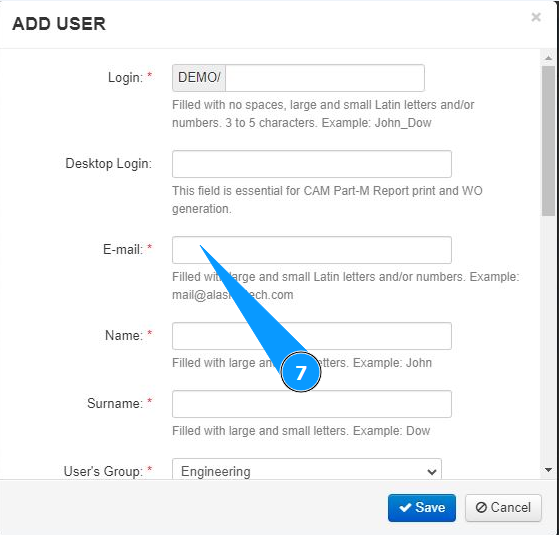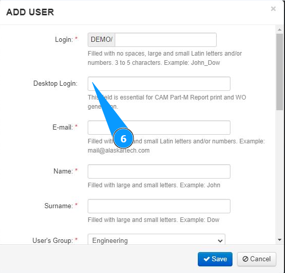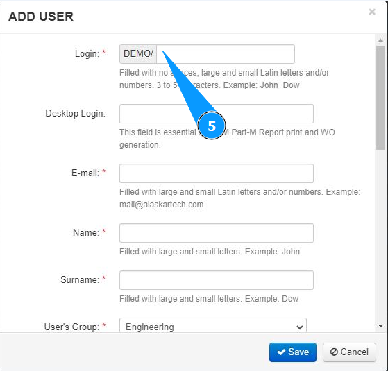 5. Внесите логин нового пользователя (в соответствии с политикой вашей компании) в поле "Login".