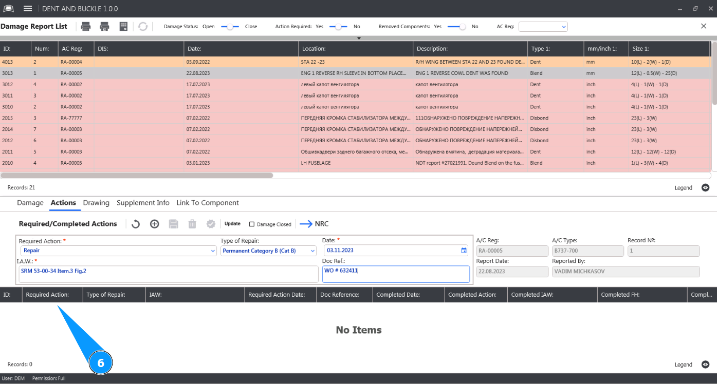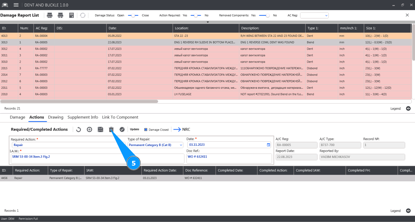 2. Выберите из списка повреждение для удаления необходимых действий и кликните по соответствующей строке в окне "Damage Report List".